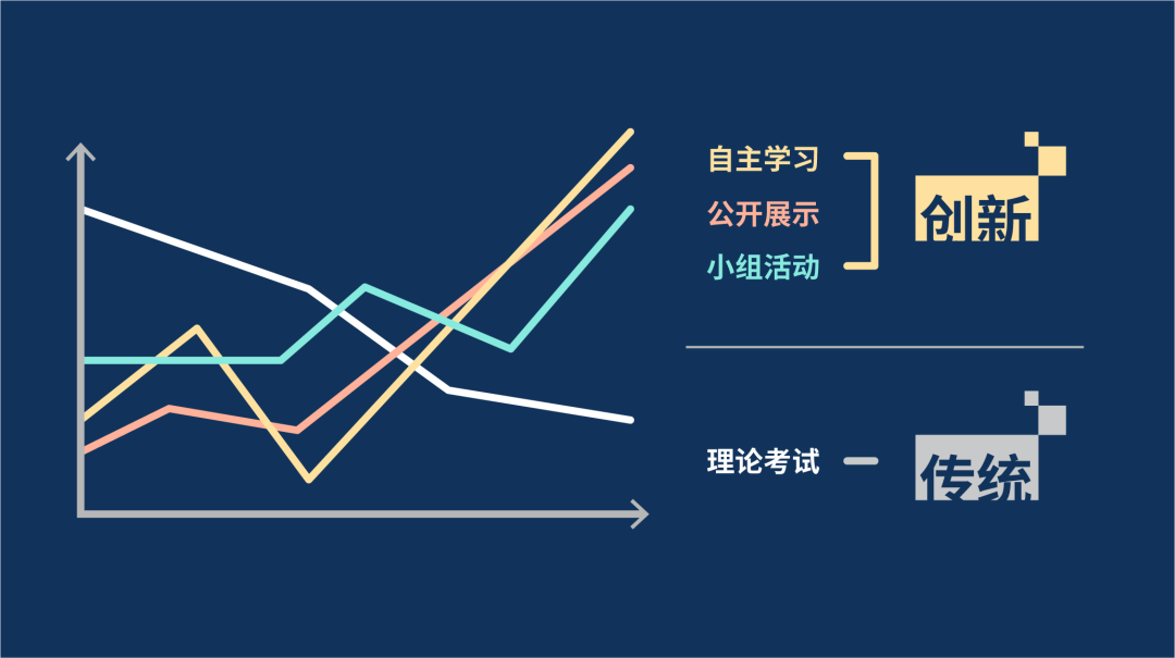 由于教学方法注重学生能力培养,在新的评价体系中,传统的理论考试评分占比被大幅压缩,而新教学方法相关的公开展示、小组活动、自主学习等指标的占比显著 UP !