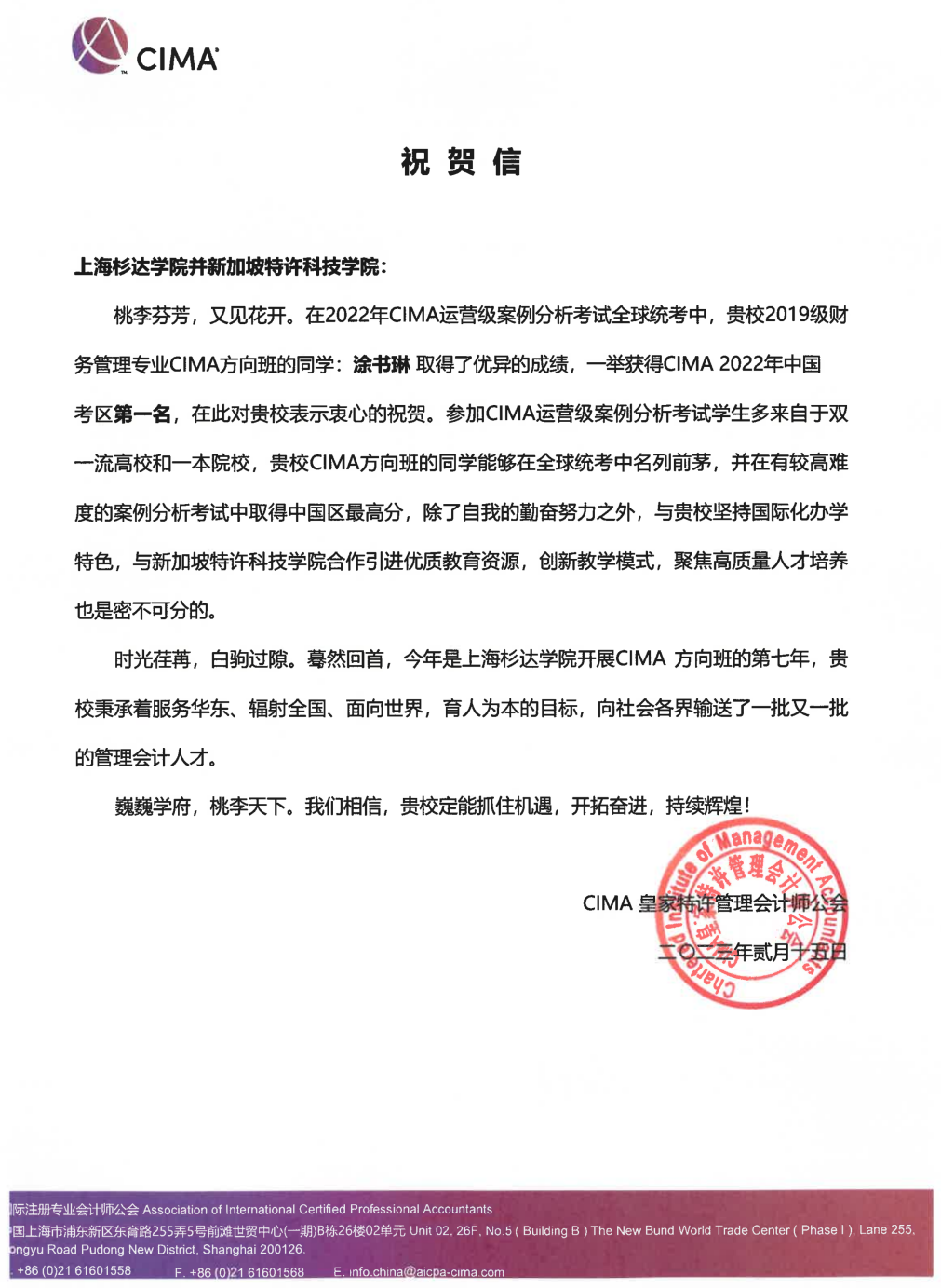 近日,2022年CIMA运营级案例分析考试全球统考成绩公布,2019级财务管理(CIMA方向)学生涂书琳一举获得中国考区第一名 ,成为单科状元。CIMA皇家特许管理会计师公会向我校发来贺信,表示除涂书琳自身的勤奋努力外,与杉达坚持国际化办学特色,与新加坡特许科技学院合作引进优质教育资源,创新教学模式,聚焦高质量人才培养也是密不可分的。