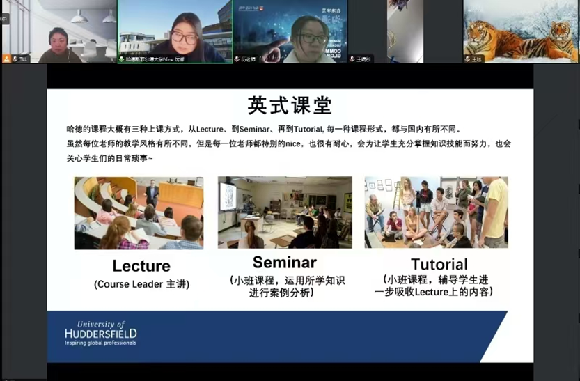 厉娜老师首先结合自身的求学经历以及后续的发展经验与大家分享,由此正式拉开了这场讲座的帷幕。接着,厉娜老师详细介绍了英国哈德斯菲尔德大学诸多方面,比如其历经岁月变迁的历史沿革、一应俱全的校园设施、独具特色的办学理念、科学先进的教学模式,以及丰富多彩的校园生活等等。
