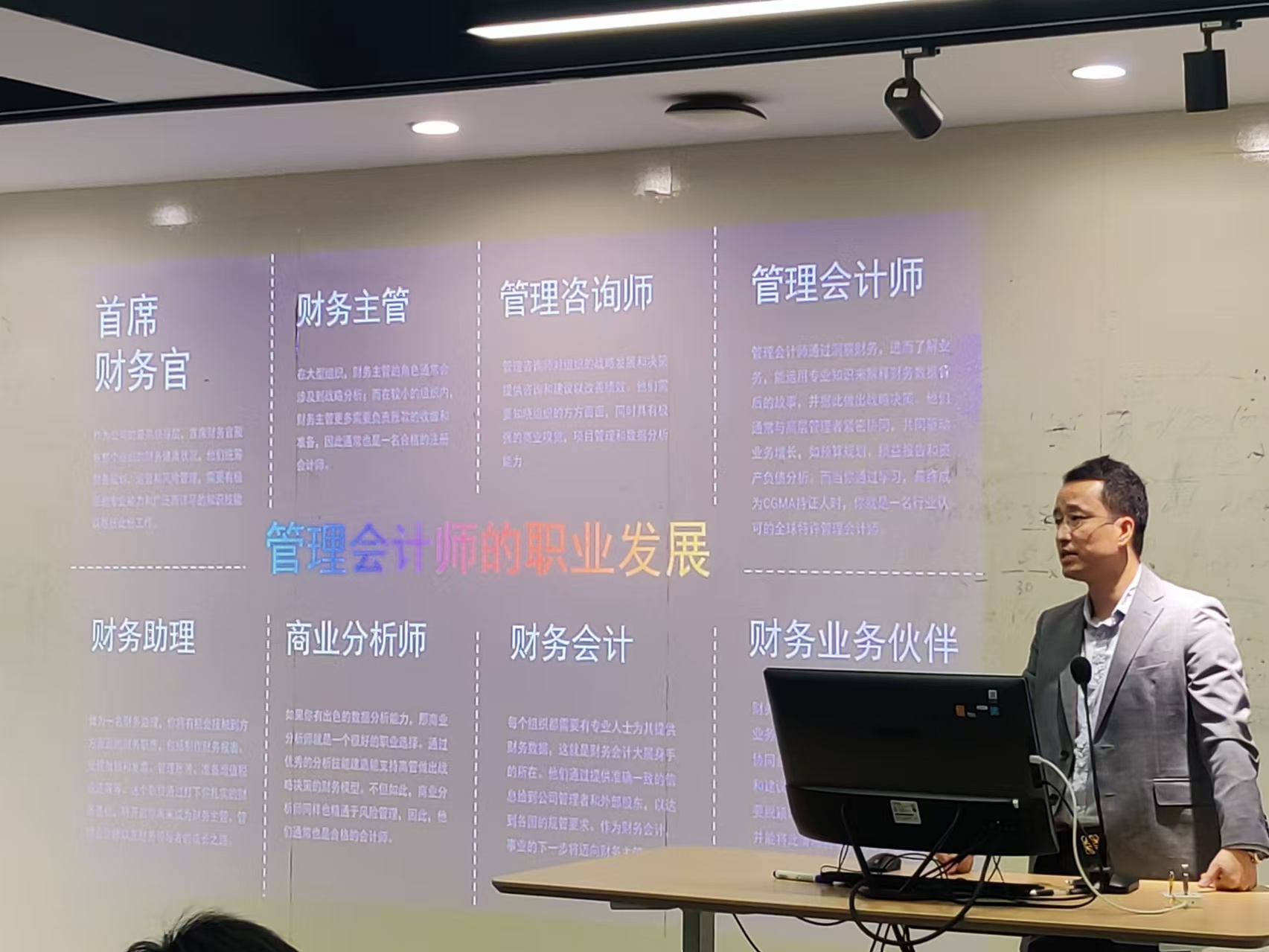 随后,CIMA 华东区代表冯勇先生向同学们深入分析了在当前考研内卷的形势下,如何才能在未来的职业选择中脱颖而出。冯勇先生详细介绍了 CIMA 的发展历程、管理会计师的价值及职业发展方向,以及 CIMA 证书对未来职业发展的诸多优势。他指出,数智时代财务职能正在发生转变,即从传统的财务核算向管理型会计转变,并且结合国家政策趋势,强调未来市场最紧缺、最需要的将是管理型会计人才。