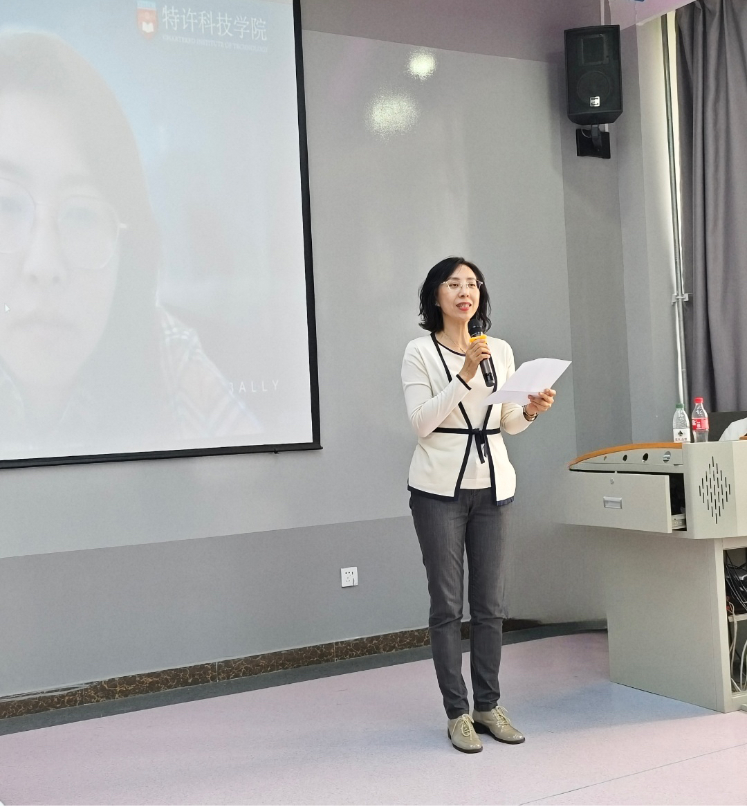 新加坡特许科技学院院长助理苏忻怡讲话,她向吉林工商学院各位领导对特许科技学院多年来的支持表示感谢,同时也向大家介绍了特许科技学院培养人才的理念及方式,以及本次比赛的目标和意义。