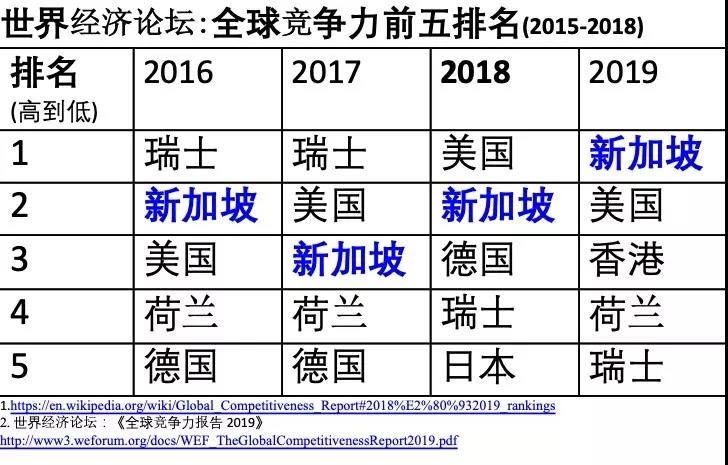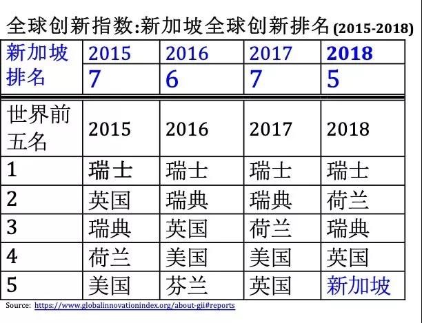 创新是竞争力的因素之一,过去10年新加坡在全球竞争力的排名连续8年第二,只有2年第三。而竞争力的其中一个表现就是人均GDP在2018年相当于人民币41万,而新加坡国土面积只有719.9平方公里,总人口五百六十万(包括外来常驻人口一百六十万),没有自然资源作为大背景。此外,新加坡连续6年在亚太地区维持全球创新指数排行榜第一位(图1、2)。