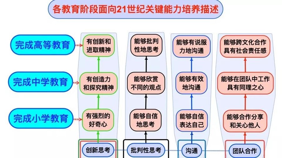 21世纪的关键能力,就是2+2+2等于1。第一个“2”是两种思维,批判性思维、思辨思维以及创新思维;第二个“2”是两种技能,沟通技能和合作解决问题的技能;第三个“2”是两种能力,解决问题能力和创新创造力。接受这样教育的学生,未来会是一个持续进行终生学习的人。