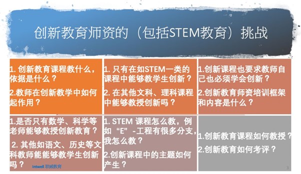 第二个困惑,就是创新课程的师资从哪里来?新加坡的师资和中国的师资还是有点不同,新加坡师资是要完成本科教育以后,再进入师范院校进行一年的培训,才进入到学校。所以,严格来讲新加坡的老师可能更具备进行STEM教学的资历。但在此过程中我们又面临一个很重要的一个挑战,我们到底需要老师在创新教学中教什么?是否只有数学、科学等老师能够教授创新教育?其它如语文、历史等文科教师能够教学生创新吗?