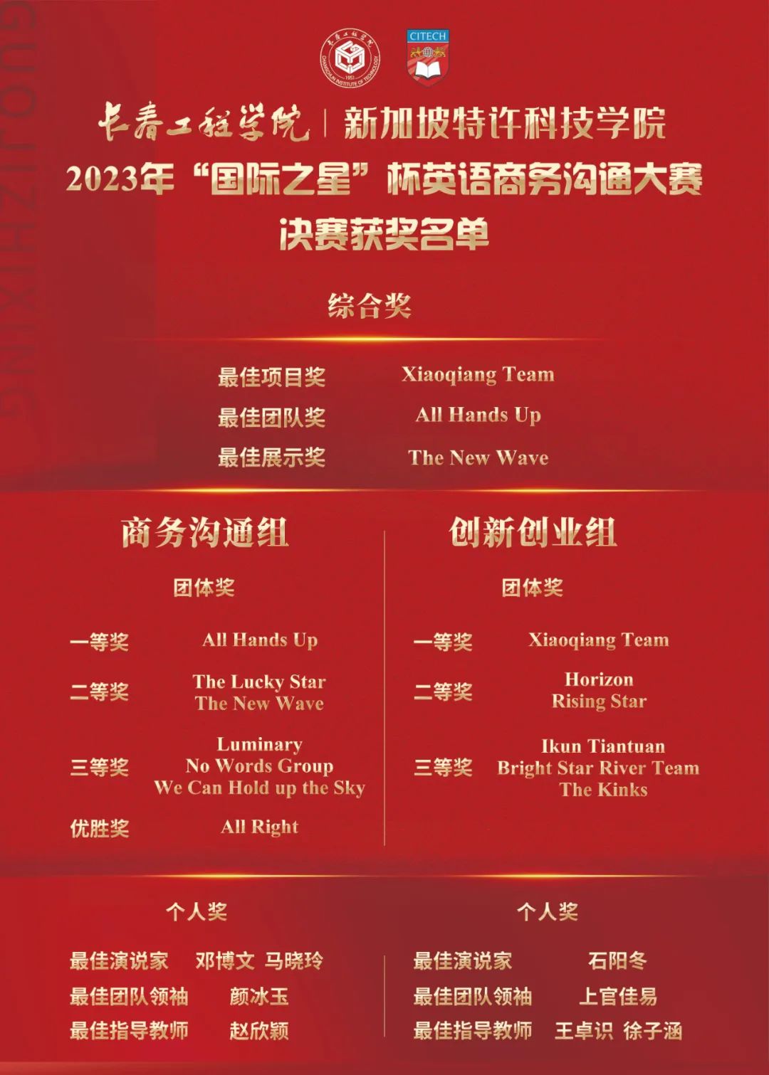 经过激烈角逐,最终All Hands Up队获得商务沟通组一等奖,Xiaoqiang Team获得创新创业组一等奖;邓博文、马晓玲、石阳冬等同学获得“最佳演说家”等个人奖项。