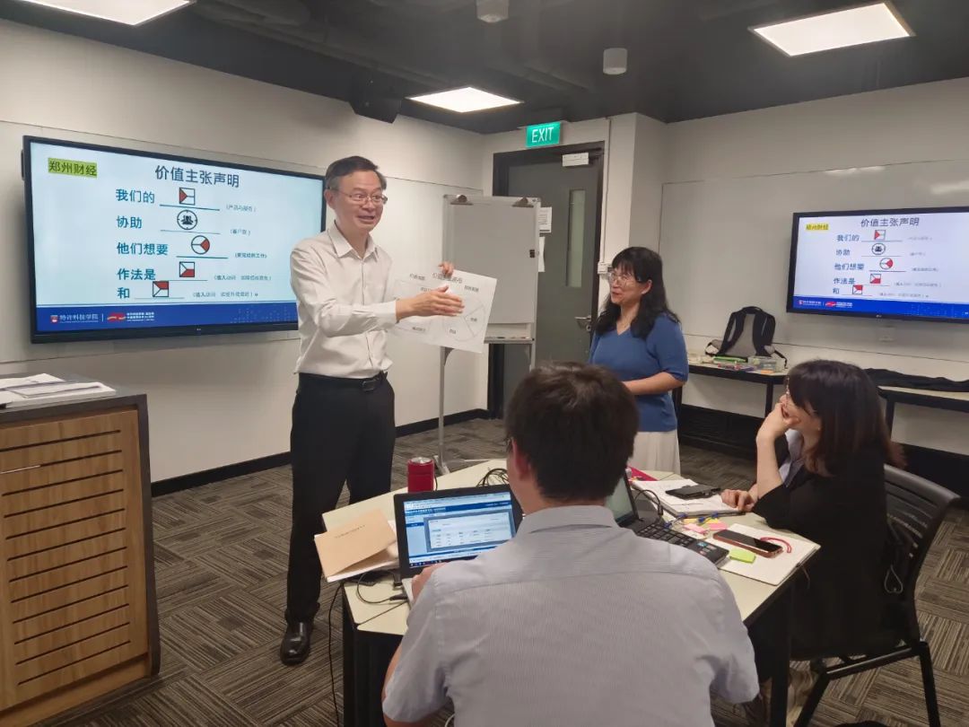 下午,新加坡管理学院教务长陈伟权博士为我校培训团教师带来主题为《如何运用创新思维工具设计思考——结合商业画布管理策划工具解决实际问题》的讲座。陈伟权博士从价值主张和客户信息两个方面展开讲解,引入价值主张画布在麻省理工学院、新加坡国立大学、北京大学等世界著名高等院校中的应用案例,使大家对价值主张画布在解决实际问题中的运用方法有了基本了解。随后,陈伟权博士组织学员们进行小组研讨,学员们积极参与,各抒己见,出色完成了课堂任务与作业提交,并对新加坡“以学生为中心”的教学模式有了更加深刻的体悟。