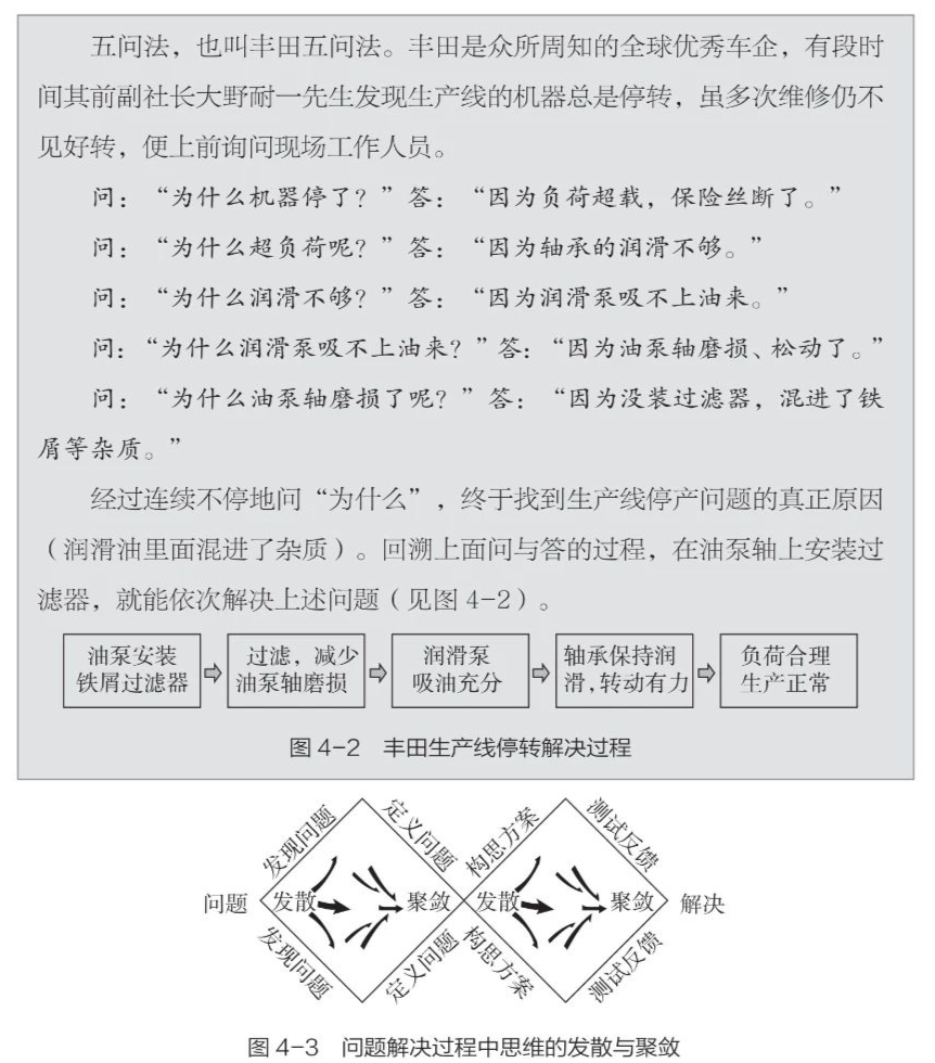 创新思维首先起步于发现问题。善于提问,坚持追问,敢于打破砂锅问到底是创新思维的重要特征。在不断发问中,思维在各种可能性中展开,然后逐渐聚焦问题产生的原因,直到最终确定真正原因。伴随着问题解决的过程,思维经历多次的发散和聚敛。现象出现时,人们发现问题常常在开动联想生成诸多可能后,再经过逻辑判断、选择收敛聚焦,问题方才不断地定位并进而明晰(见图4-3)。这一过程通常被称为创造性问题解决模式,即CPS模式。五问法在面对问题时通过不断地追问,从而准确地定义问题,为问题解决指明方向。