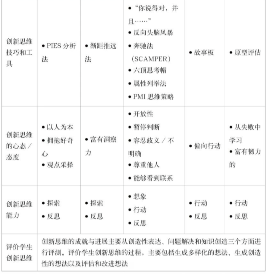 创新思维存在于整个设计思维的流程中(见下表),在培养创新思维时有一些行之有效的技巧和工具。教师应了解如何教授学生掌握这些创新思维工具,包括有什么、在哪里用、和谁用以及如何用等问题。