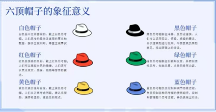 而蓝色思考帽则发挥着统筹全局的关键作用,精准把控思考方向,让讨论始终围绕核心目标有序推进。