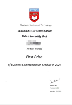 平时跟紧上课的节奏,认真完成作业和小组沟通项目,加上Tony老师有针对性地进行了考前辅导和答疑解惑,让我对考试充满信心,顺利地取得了课程证书。这份证书和奖学金不仅给我带来了喜悦、肯定和荣誉,更重要的是在学习的过程中我的个人表达能力和小组沟通协作能力得到了提升。最后,很感谢学校和老师为我们提供了参加课程学习的平台,让我有这次宝贵的机会接触到这门课程的内容和考试。荣誉既是终点也是起点,如果往后还有类似的课程,我也会把握住机会,积极参加。
