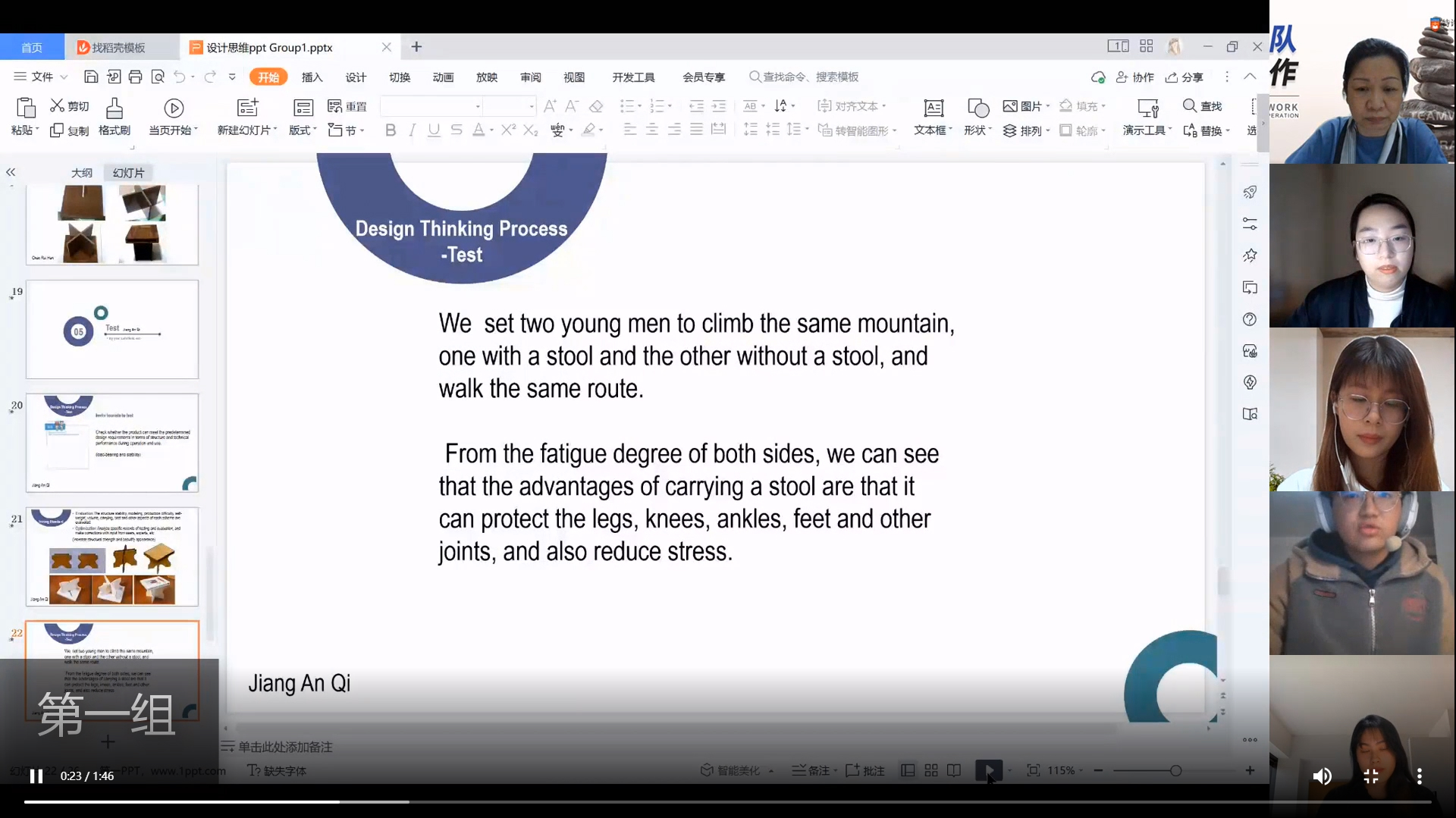 There are five stages in thinking design,Empathize: research your users' needs. Define: state your users' needs and problems.Ideate: challenge assumptions and create ideas. Prototype: start to create solutions. Test: try your solutions. According to these five steps, we put forward our own theme and expressed our views in the form of PPT.