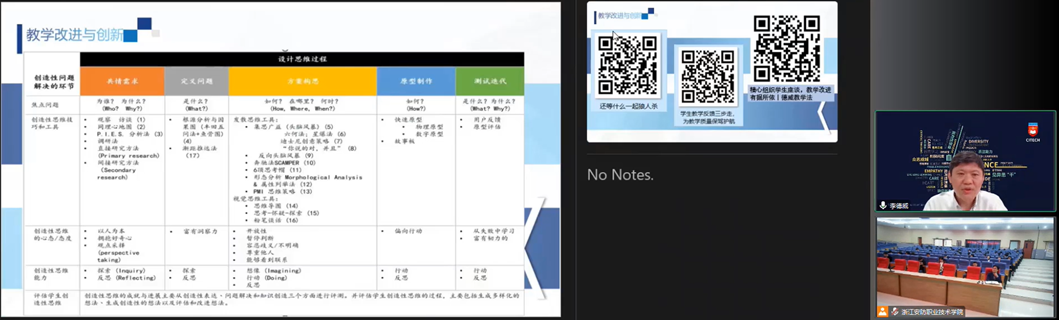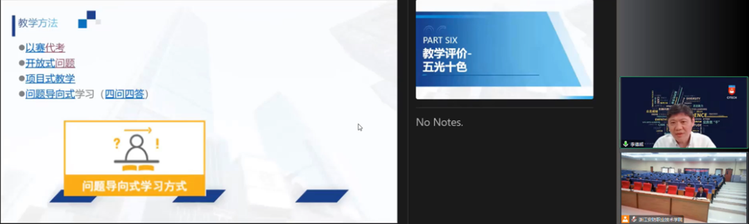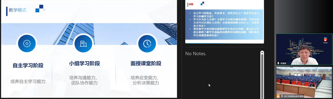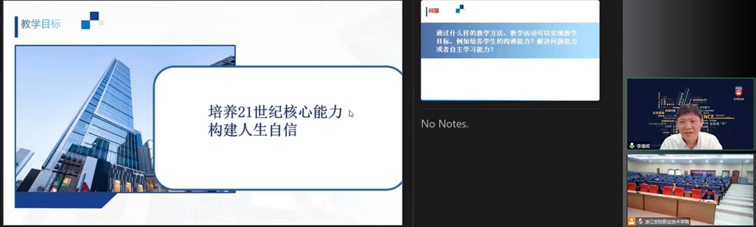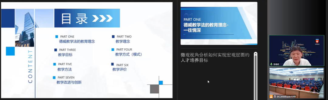 本次报告李院长以线上方式为各位领导和老师带来“VUCA时代培养能力与自信为导向的教学法与实践”的专题讲座。首先李院长引用近期很火的ChatGPT介绍了VUCA时代的特性,其次从教育理念、教学理念、教学目标、教学模式、教学方法、教学评价以及教学改进与创新七个方面诠释了德威教学法,并配以形象生动的成语概括,结合视频展示,帮助各位老师更好地理解。