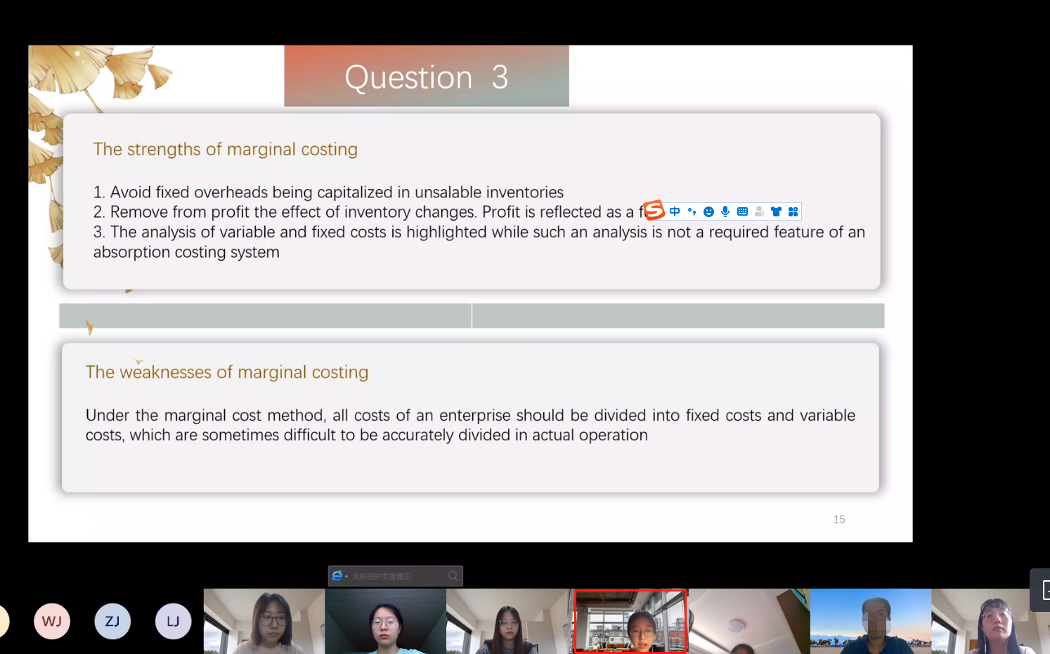 杨同学(20级):在Mr.Yuan老师的细心专业讲解下,让大家对《管理会计》这门课有了深入的了解。经过两周的学习,同学们在最后一天以PPT形式展示自己的学习成果。通过PPT制作以及在同学们面前全英讲解,这是非常锻炼同学们自信心的。在小组准备过程中,也锻炼了组员之间的沟通能力,锻炼了组长解决问题能力。